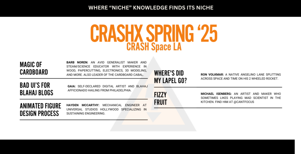 With some amazing speakers, we learned about topics ranging from carbonating fruit to the best way to cut and construct with cardboard. Keep your eyes out for the CRASHx this Summer, and sign up for updates on our on our public Google Group, Discord server, or follow our Instagram!