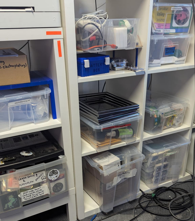 - Wire shelves to make project storage accessible to members. Members can leave items for up to 30 days with a parking permit.