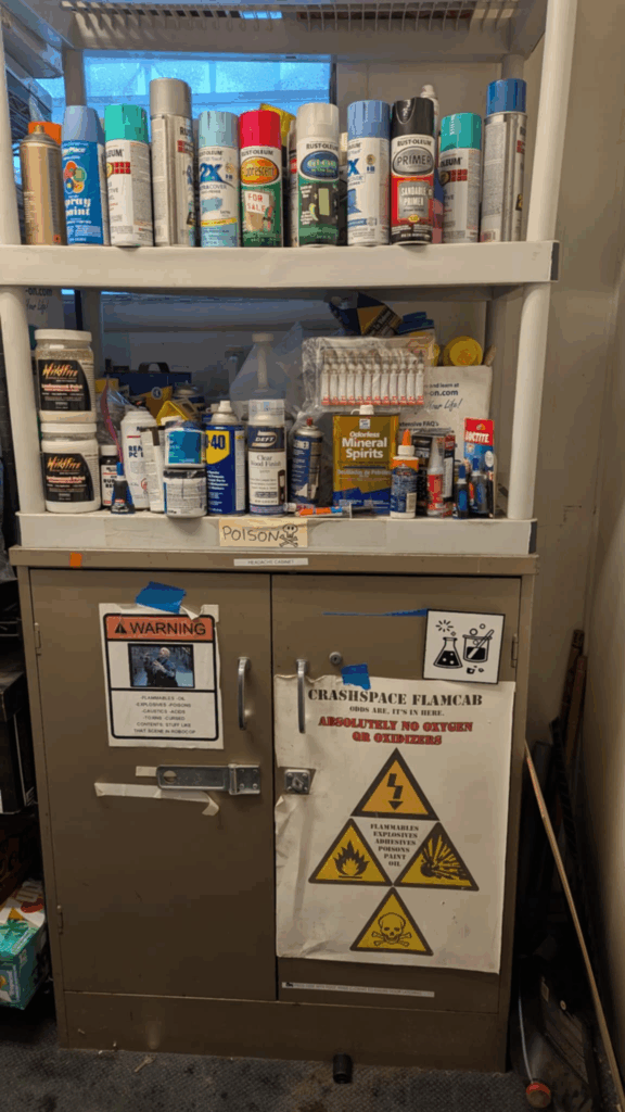 - Notes: Stores various spray paint and chemicals, use carefully, and do not drink. You will find adhesives, lubricants and solvents here, including Isopropyl alcohol on the shelf to the left