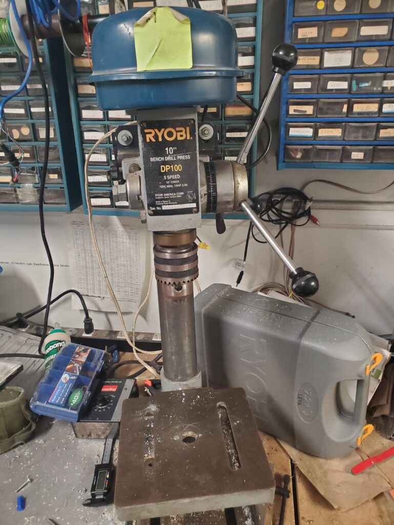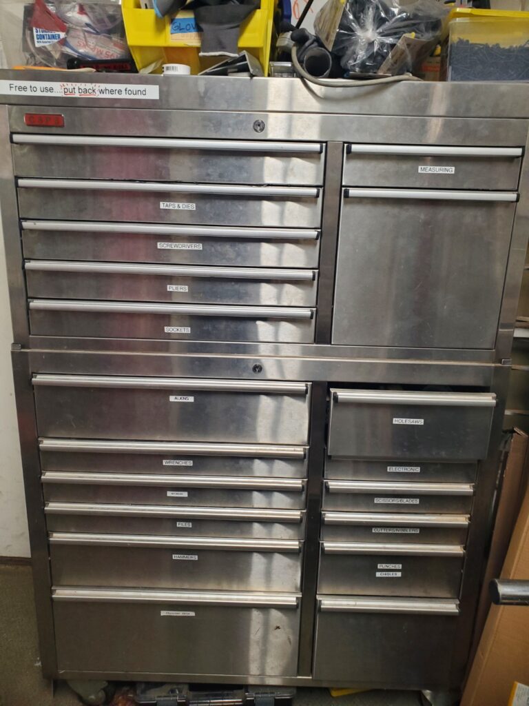- What it does: This is where you can find most of our tools such as the screwdrivers, aliens (allen wrenches), measurement tools, most hand tools wrenches sockets taps dies. The portable drills are located next to the small drill press in shop 1