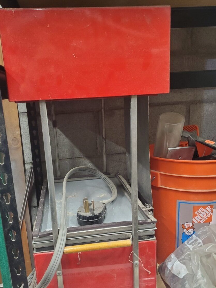 - Notes: This is located to the left of the drill press and is attached to the wall via U bolts. Use the switch on the main body to turn it on, and the provide pressure to the foot pedal below to activate/adjust speed