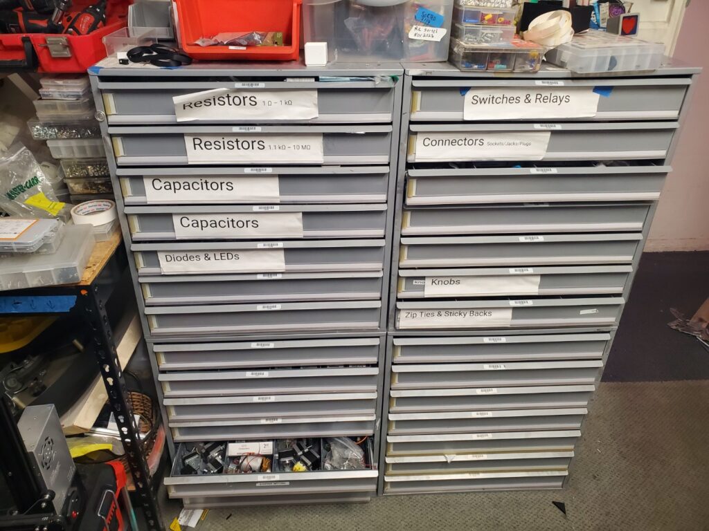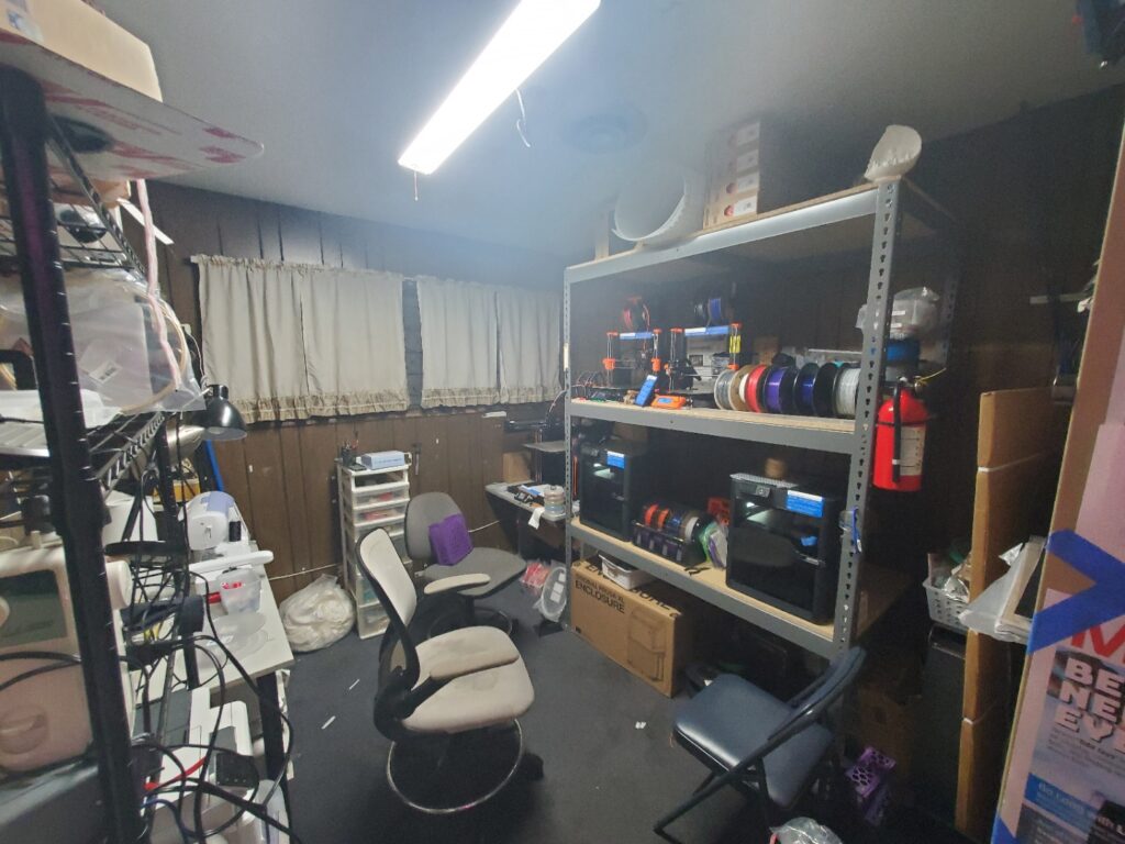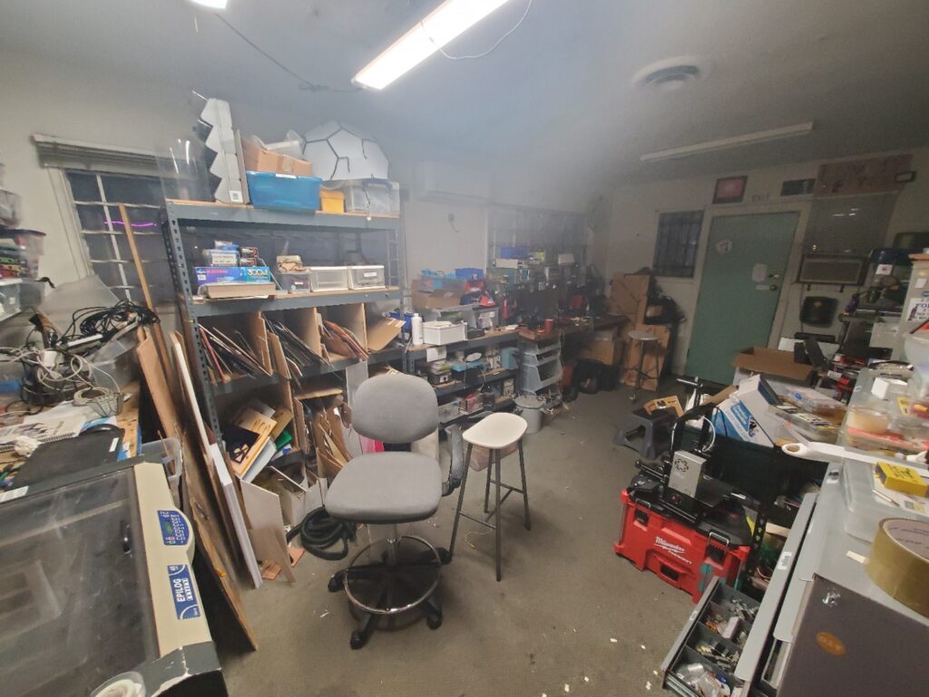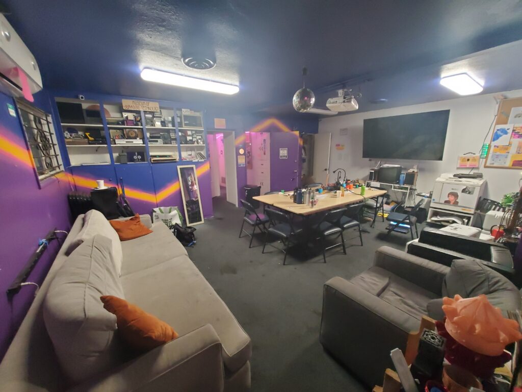 What it is used for: The front room where all public events are held and where most people just hang out and do work together. As the name suggests, the public room is open to all, membership or not. This is the room that is shown in the virtual meeting or where we meet physically, and is a common hangout/open discussion spot for everyone. Feel free to bring your crafts and work alongside or with others, but be mindful if there is a scheduled meeting which has priority over the space/active discussion