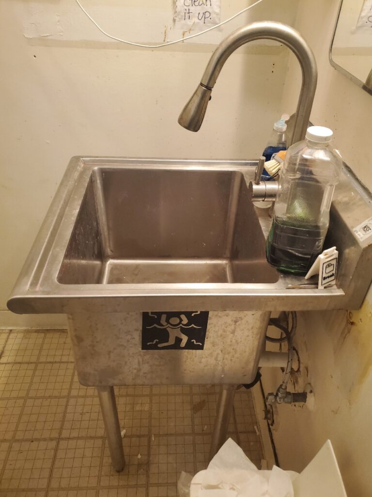 - What it does: Industrial sink with stronger soap. Use this sink for larger cleanups. Ask before dumping any heavy chemicals or mystery concoctions down the drain as we have more sensitive plumbing.
